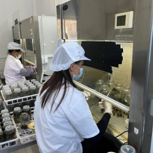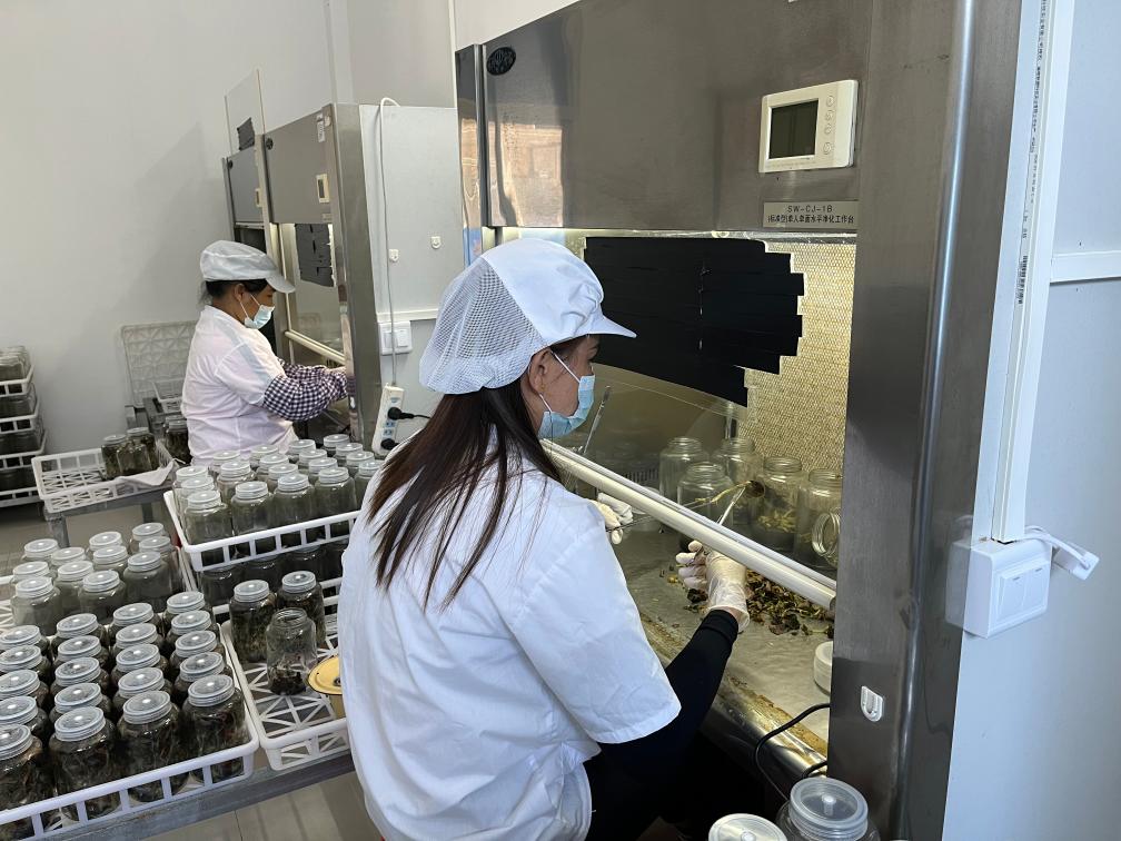 在海南省白沙黎族自治县方平村的一处旧楼房里,村民们正在进行金线莲无菌接种,用剪刀将金线莲剪成一截截,放进装着营养液的玻璃罐中。育苗工作紧锣密鼓开展,育成的种苗将于今年9月定植。