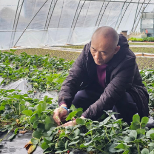 九三村村民李义承包的草莓温室大棚内,秧苗上的草莓娇艳欲滴。刚刚送走一批采摘的客人,他正查看土壤湿度,决定是否打开滴灌系统。“棚室日间不能高于30摄氏度,夜间不能低于8摄氏度,还要注意不能缺水。”