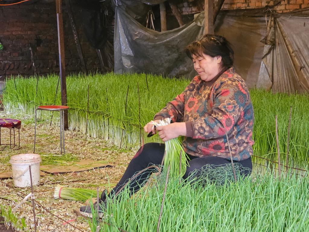 3月28日,九三村村民孙亚梅正在修剪蒜苗。新华社记者 孙晓宇 摄