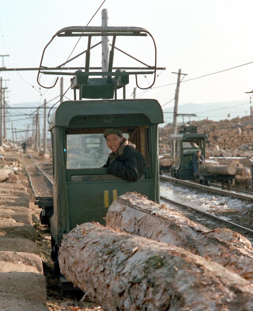 1979年,小兴安岭丰林林业局贮木场工人用电瓶车集材。