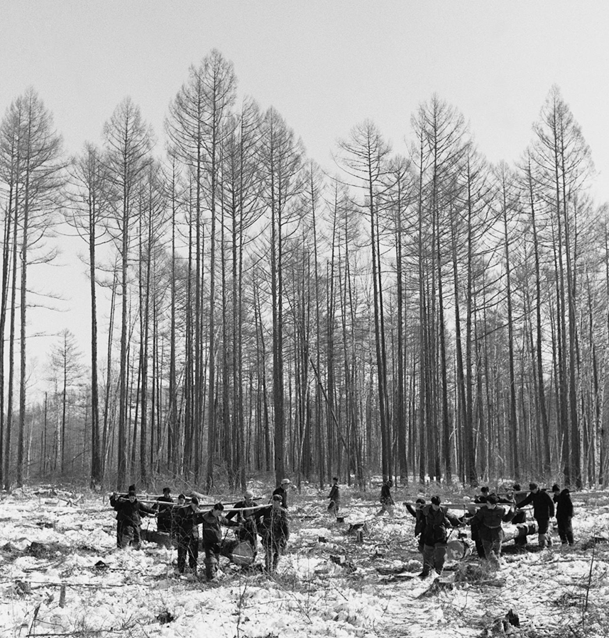 1959年,工人们在小兴安岭深处伐倒茂林中的树木,为筑路做好准备工作。