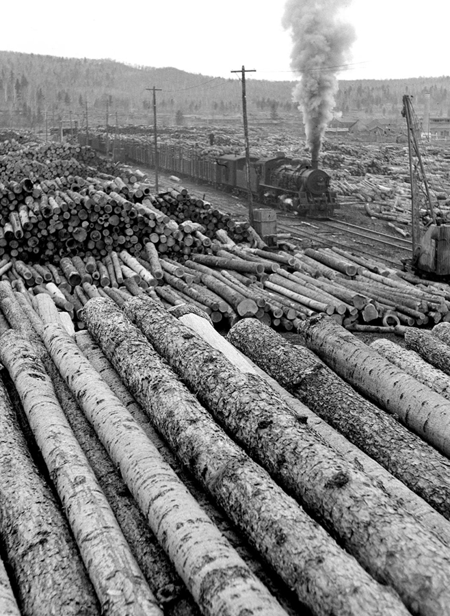 1963年,小兴安岭上甘岭林业局贮木场上满堆着木材。