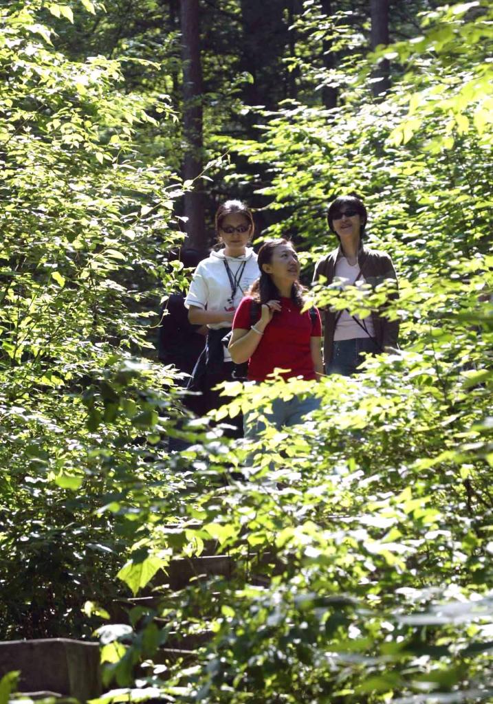 2003年7月17日,几名旅游者在伊春市五营国家森林公园漫步。