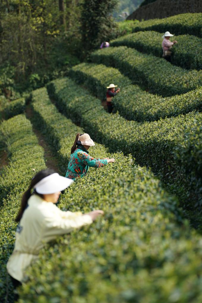图为茶农在陕西省安康市汉滨区双龙镇龙泉村茶山上采茶。新华社记者邵瑞 摄