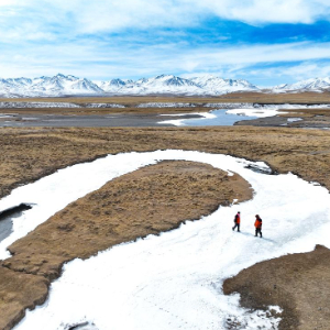 ↑3月21日,叶金俄日(右)与东木措在青海省海北藏族自治州祁连县的黑河流域巡护(无人机照片)。 新华社记者 张龙 摄