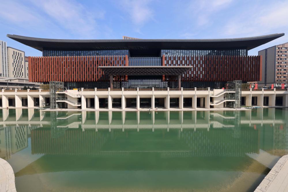 蓝天白云下,水平延展的屋顶,犹如平摊开的书页。启动区这座颇具中国风的图书馆外立面上,一片片竖向梭形百叶,以简牍为意象,而且是可调节的遮阳装置,可随着阳光转动,自动调节室内光线。