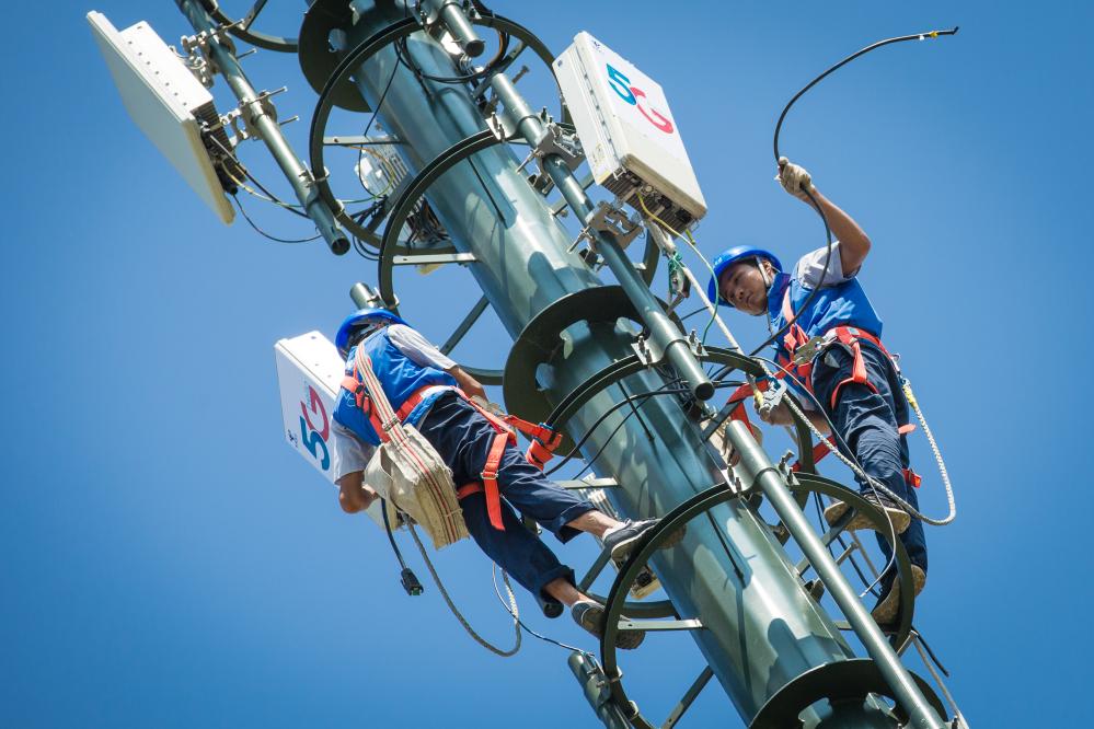 通信塔工正在架设5G基站。新华社记者 陈爱平 摄