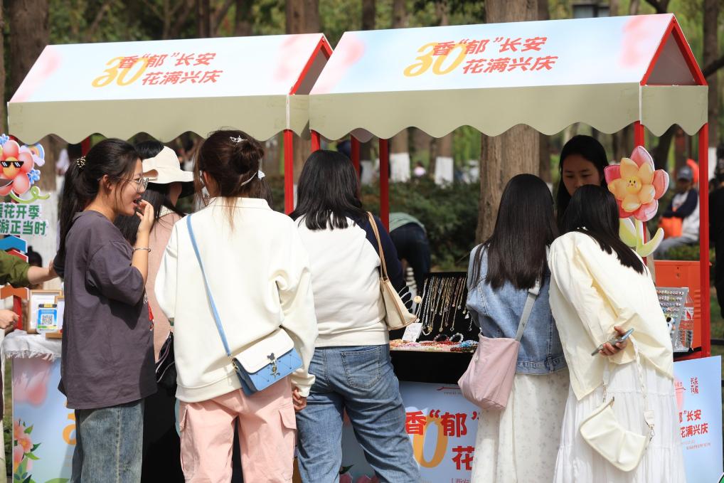 兴庆宫公园郁金香牡丹花卉展上的集市吸引了不少消费者。受访者供图