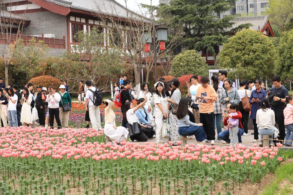 西安市兴庆宫公园市场营销部工作人员李婧慧说,公园的郁金香牡丹花卉展已成功举办30年,今年除20余万株花卉外,公园还组织了露营、集市、码头游船、唐嬉坊主题乐园、龙池坊唐风街区等游玩项目,为春日赏花之旅增添更多韵味。花展自3月30日开幕以来,周末和假期日均游客接待量超过10万人次。