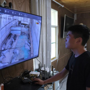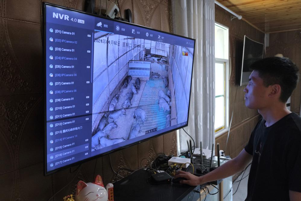 赶水镇洋渡村的“95后猪倌”张开镒通过监控查看圈舍内情况。新华社记者吴楠 摄