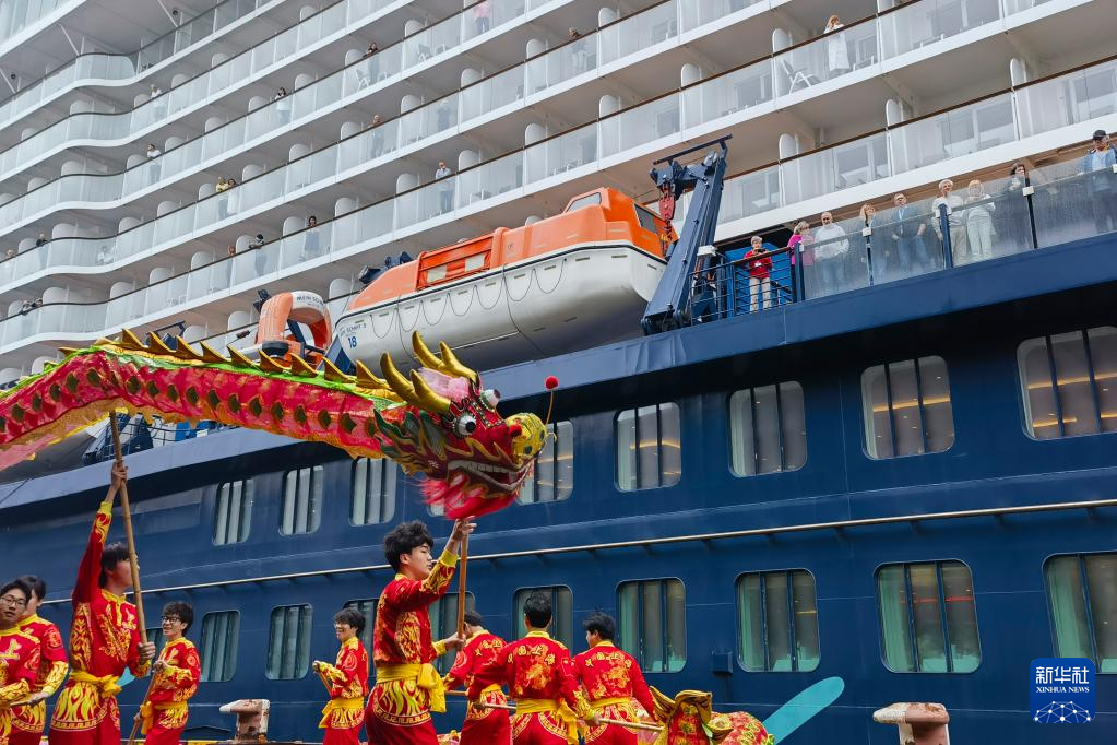 4月6日,上海吴淞口国际邮轮港举办舞龙舞狮欢迎仪式。新华社记者 陈爱平 摄