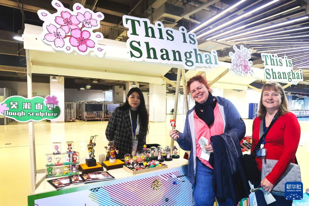 4月6日,游客在上海吴淞口国际邮轮港游客通道的非遗展示摊位合影。新华社记者 陈爱平 摄