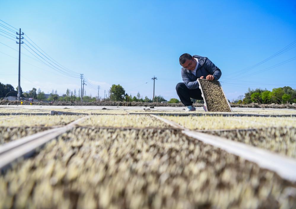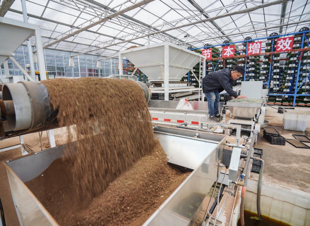 4月3日,在四川省眉山市彭山区天府粮仓数智水稻示范基地,罗凯在循环式育秧机上查看水稻秧苗长势。