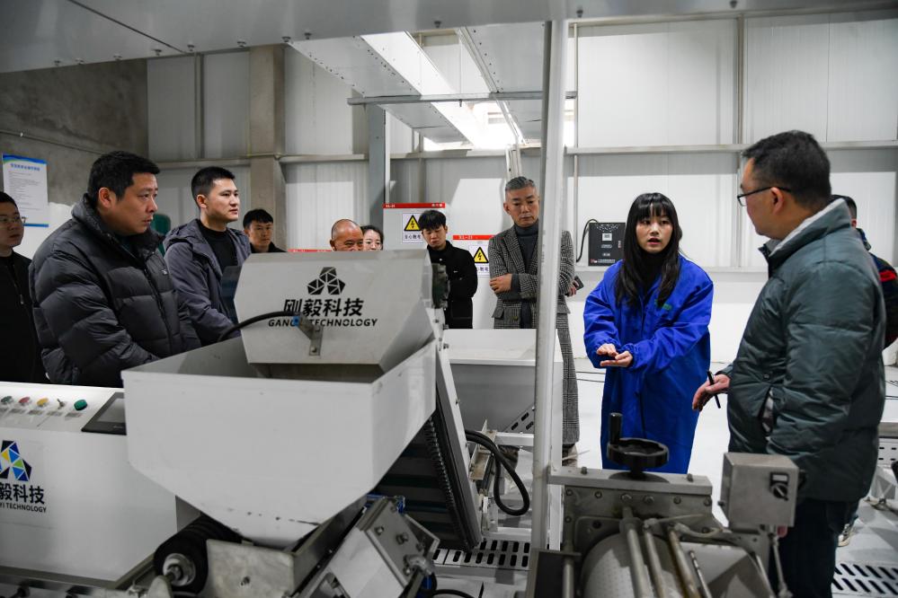 3月8日,在四川省成都市崇州市隆兴镇,王伶俐(右二)在和其他种粮大户交流智能育秧设备的使用情况。