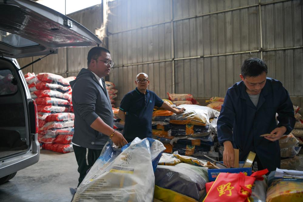 3月28日,在四川省成都市崇州市三江街道,舒星宇(左一)在合作社清点种植大户送来的水稻种子。