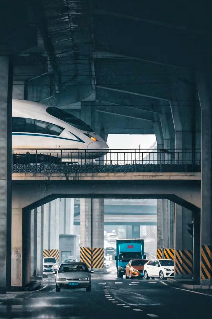 在立交桥洞中穿行的高铁