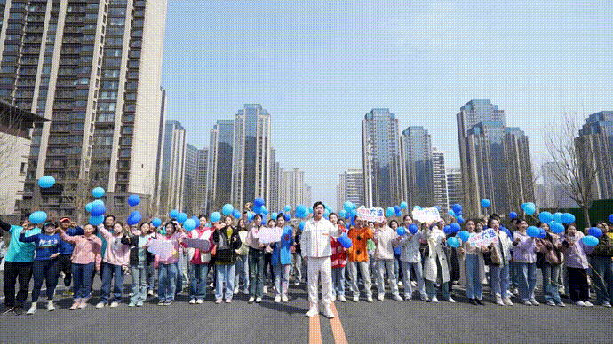 近百名手持蓝色气球的歌手