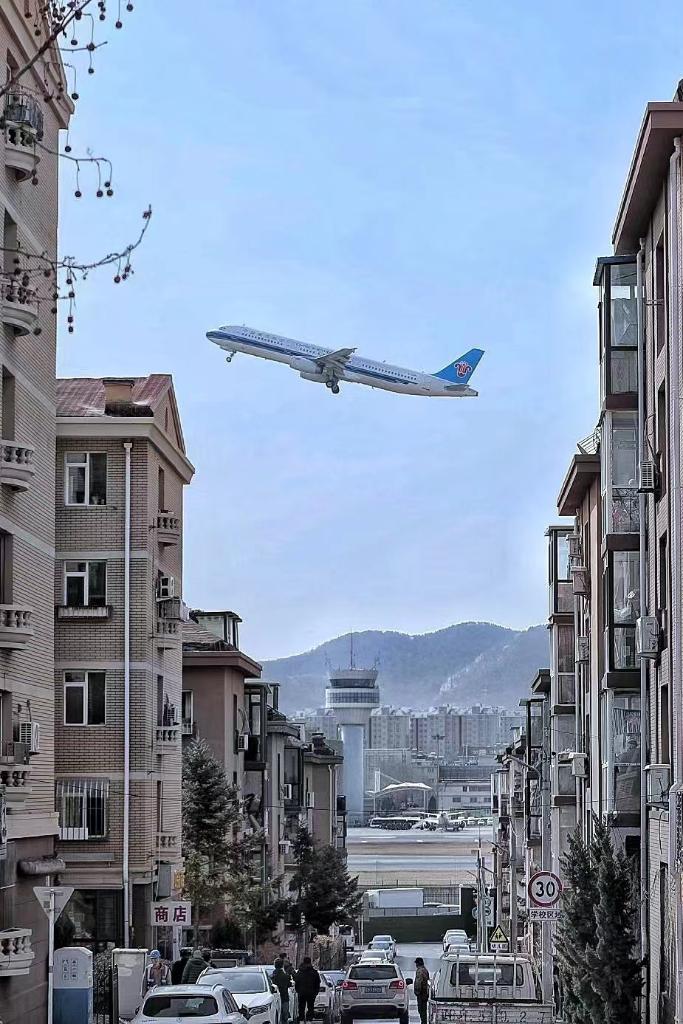 在楼群中起飞的民航班机