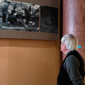 2024年4月8日,龙京沙在里耶秦简博物馆凝望2004年秦简发掘现场的照片 。新华每日电讯记者翟翔 摄