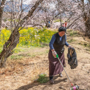 尼玛曲吉在嘎拉村桃花园里捡拾垃圾。新华社记者丁增尼达 摄