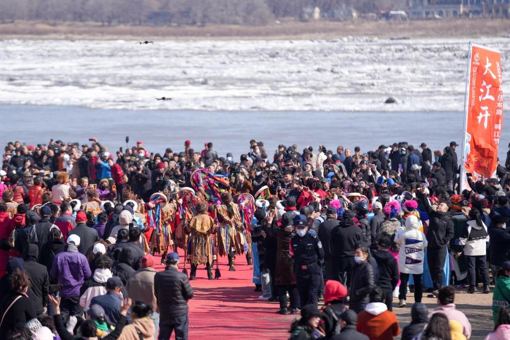 “开江了!开江了!开江了!”万余名市民相聚在黑龙江省佳木斯市的外滩广场和栈道上,身着萨满服饰的赫哲族组成的祈福队伍,面朝松花江佳木斯段江面,喊出了对风调雨顺的期待和对美好生活的祝愿。