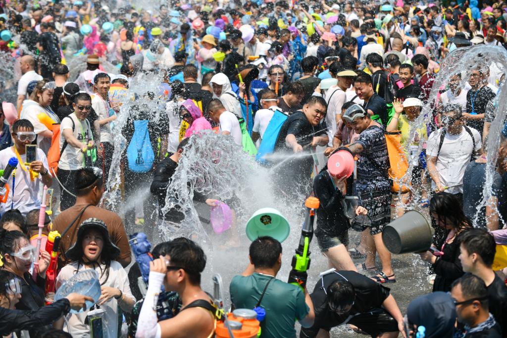 4月15日,人们在云南省西双版纳傣族自治州景洪市泼水广场上参加泼水狂欢活动。新华社记者 王静颐 摄