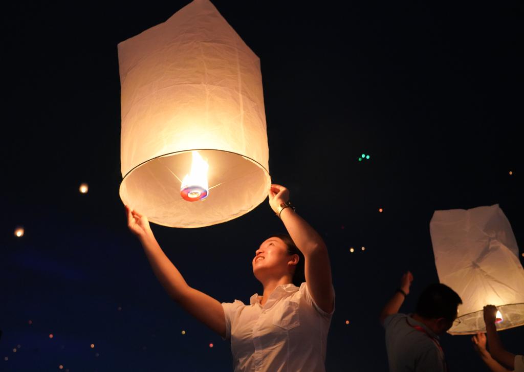 4月13日晚,人们在云南省景洪市澜沧江边放飞孔明灯。新华社记者 王静颐 摄