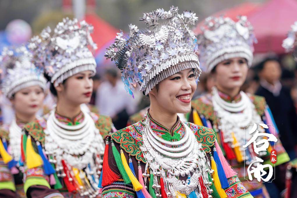 ↑湖南省怀化市通道侗族自治县牙屯堡镇,当地群众盛装游行前往大戊梁文化广场。CICPHOTO/粟勇主 摄