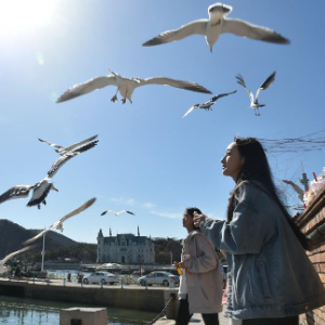 2024年4月18日,游人在大连老虎滩渔人码头游览。新华社记者 鲁鹏 摄