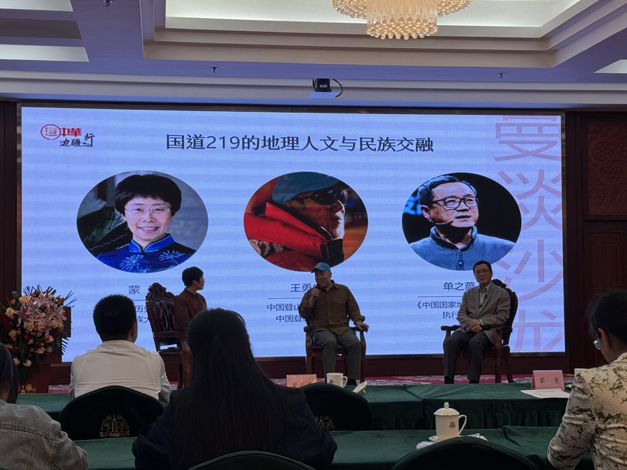 在通气会上,蒙曼还与中国登山协会副主席、中国登山队队长王勇峰、《中国国家地理》杂志执行总编单之蔷围绕“曼行国道·219”沿途的地理人文、户外注意事项等话题进行对话。嘉宾们分享了自身探访219国道相关经历,有针对性地提出专业指导建议,为蒙曼此次边疆行强心助力。