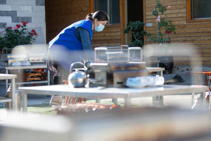 图为一名社区工作者在淄博市高青县田镇街道帮助烧烤摊主摆放餐具。(新华社发 张维堂 摄)