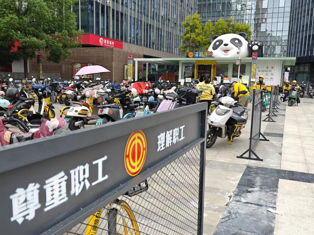 成都高新区的中航城市广场,小小的“溪友驿站”备受欢迎。27岁的田文辉在成都就业一年有余。“骑手的手机最耗电,驿站能免费充电,还有修车工具箱。”他说。