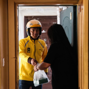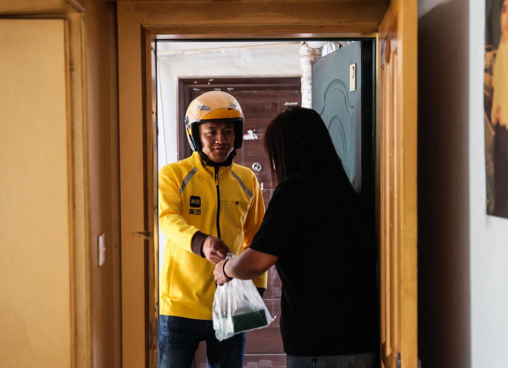 美团平台长春红旗街配送站站长王文思为客户提供服务。新华社记者 王帆 摄