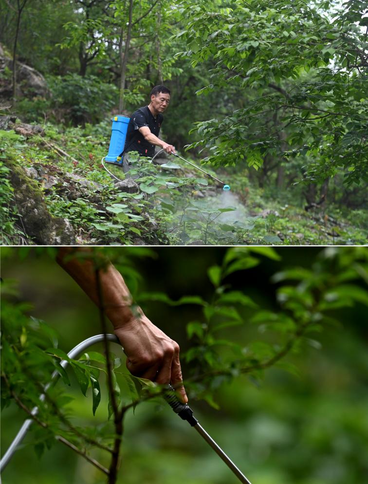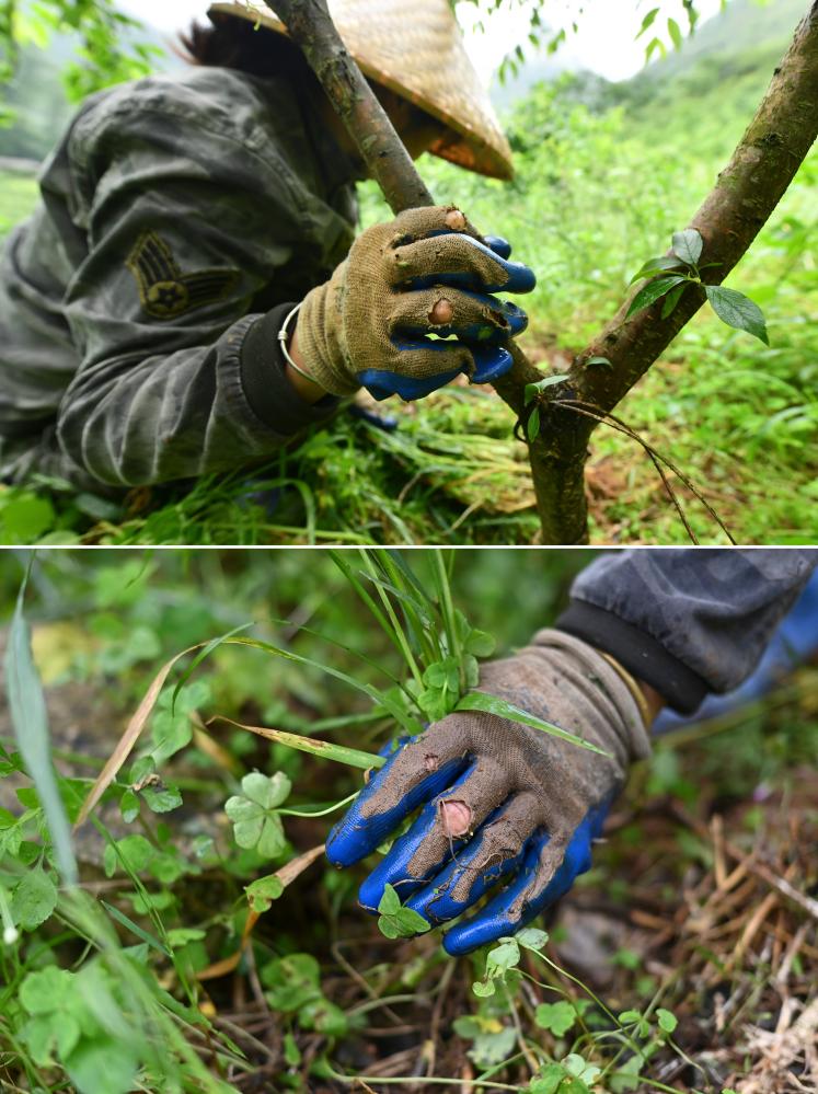 在广西柳州市融安县东起乡铜板屯,61岁的龙飞任在山上为果树除草(4月23日摄)。10多年来,龙飞任返乡创业,和村民们一起发展水果种植和观光旅游。