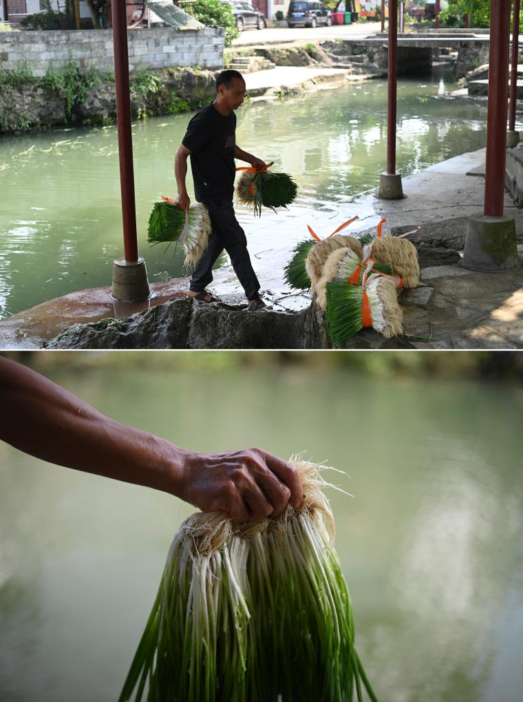 在广西柳州市柳江区三都镇觉山村,村民韦文中搬运香葱,准备供应市场(4月16日摄)。香葱种植产业是觉山村村民增收致富的支柱产业,韦文中种植10多亩香葱。