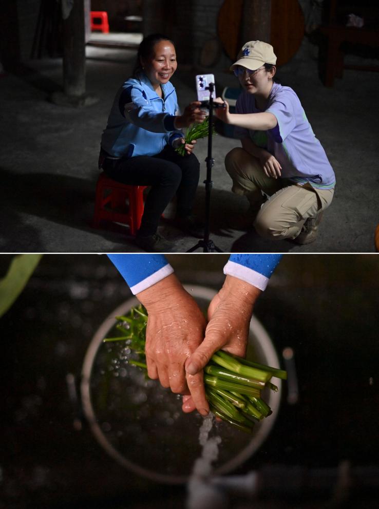 上图:在广西柳州市融水苗族自治县杆洞乡乌英苗寨,48岁的梁足英(左)向大学生学习直播带货;下图:梁足英在洗野菜,准备销往县城(4月30日摄)。近年来,她积极参加夜校学习,并通过网络直播销售当地蔬菜。