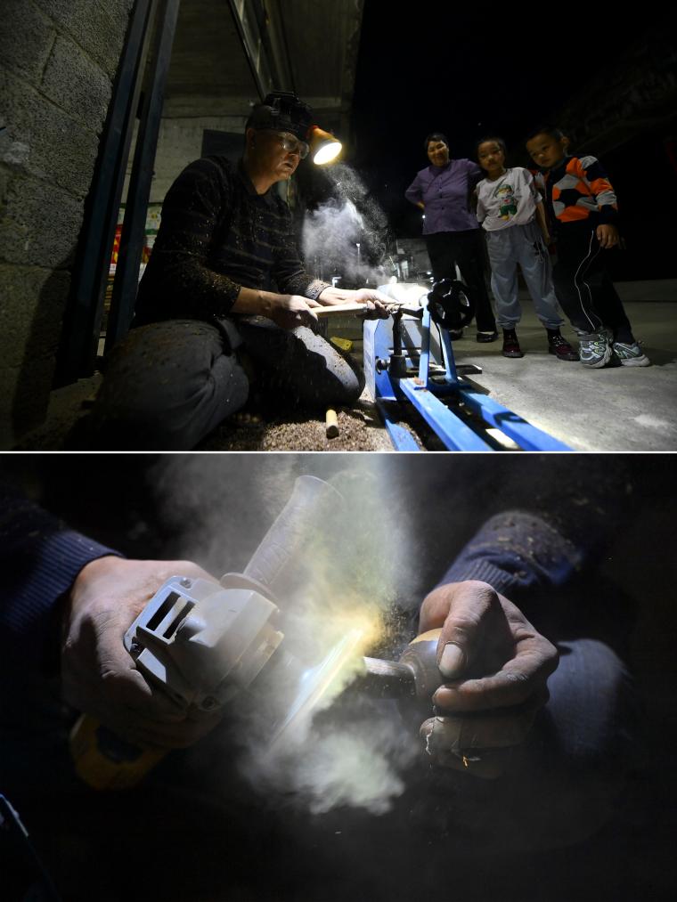 在广西大化瑶族自治县大化镇仁良村,非遗传承人韦寿基在制作陀螺(2023年4月16日摄)。作为当地传统陀螺手艺人,韦寿基经常组织村民进行陀螺比赛,积极传承非遗文化。