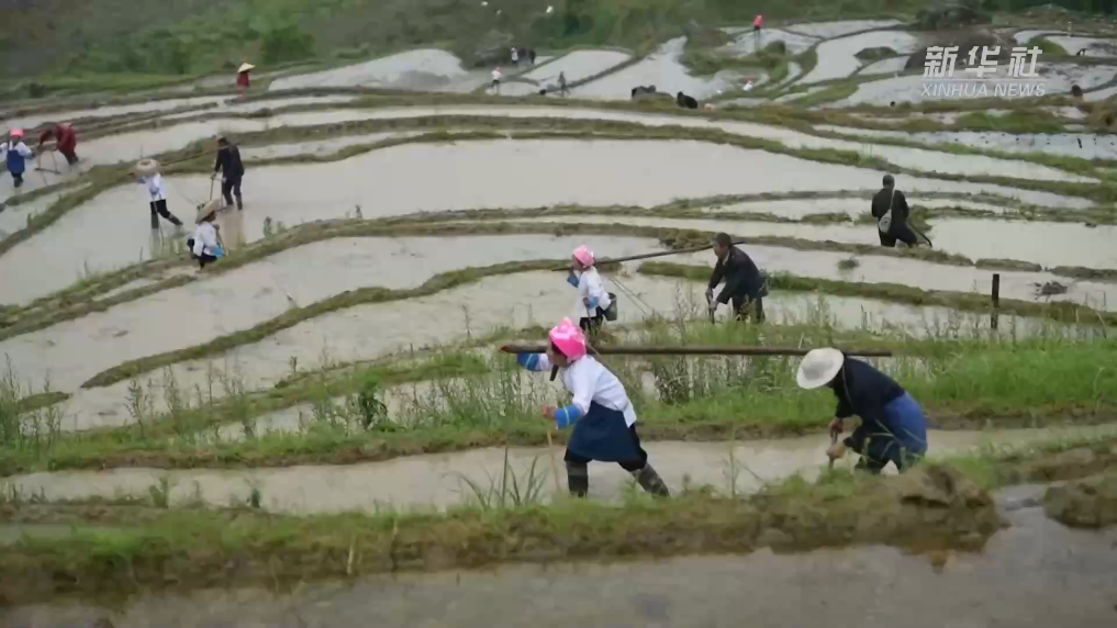 5月2日,广西桂林市龙胜各族自治县龙脊古壮寨举行一年一度的“开耕节”,当地村民在梯田上开展耦耕、牛耕、挖田、砍田基、扶田基、除草等传统农事活动,展现了一幅美丽的立体农耕图景,活动吸引众多国内外游客前来旅游体验。