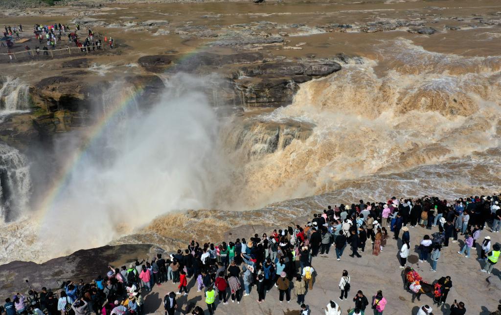 连日来,受黄河上中游降水影响,位于山西吉县和陕西宜川县交界的黄河壶口瀑布水流由清变黄,在阳光的照射下呈现出“浊浪滔天、金流飞瀑”的壮美景观,吸引众多游客观看。