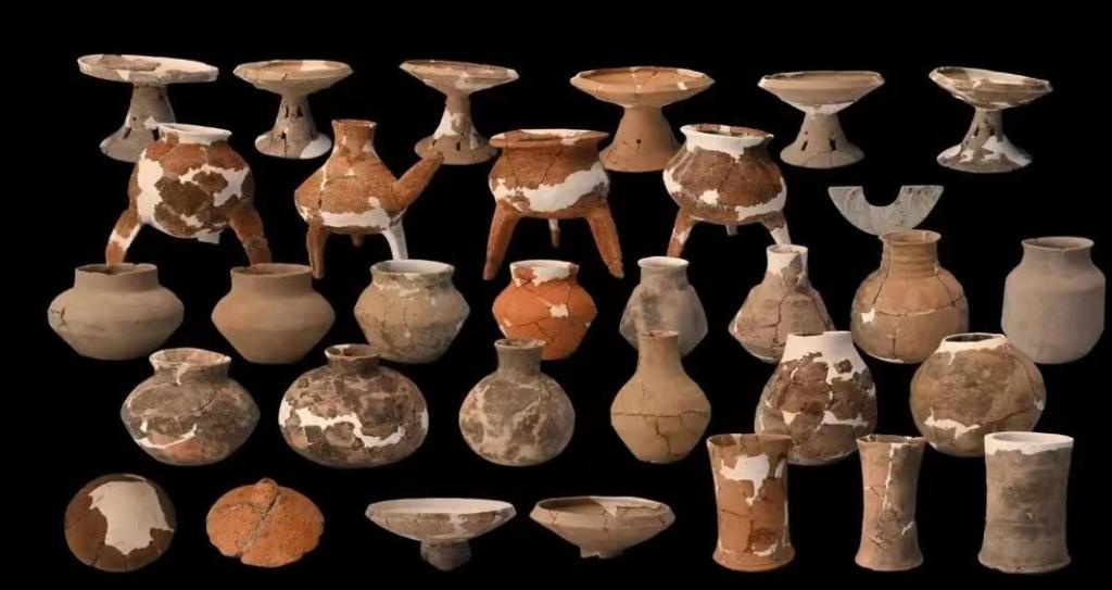 寺墩遗址的崧泽文化遗存分布于墩北和墩东台地,面积约1.5万平方米,已发现墓葬区、干栏式建筑、水井等遗存。墓葬高土台上发现的建筑遗迹,类似大型的祭坛。其中墓葬共40座,出土大量陶器、玉器、石器等珍贵文物。水井内出土6件漆彩陶壶,以红、黄、黑三彩绘制的编织纹卷尾鸟形象陶壶最为精美。多位考古学者表示,绵延千年的发展历程,昭示着寺墩古国的文明程度已达到很高的水平。