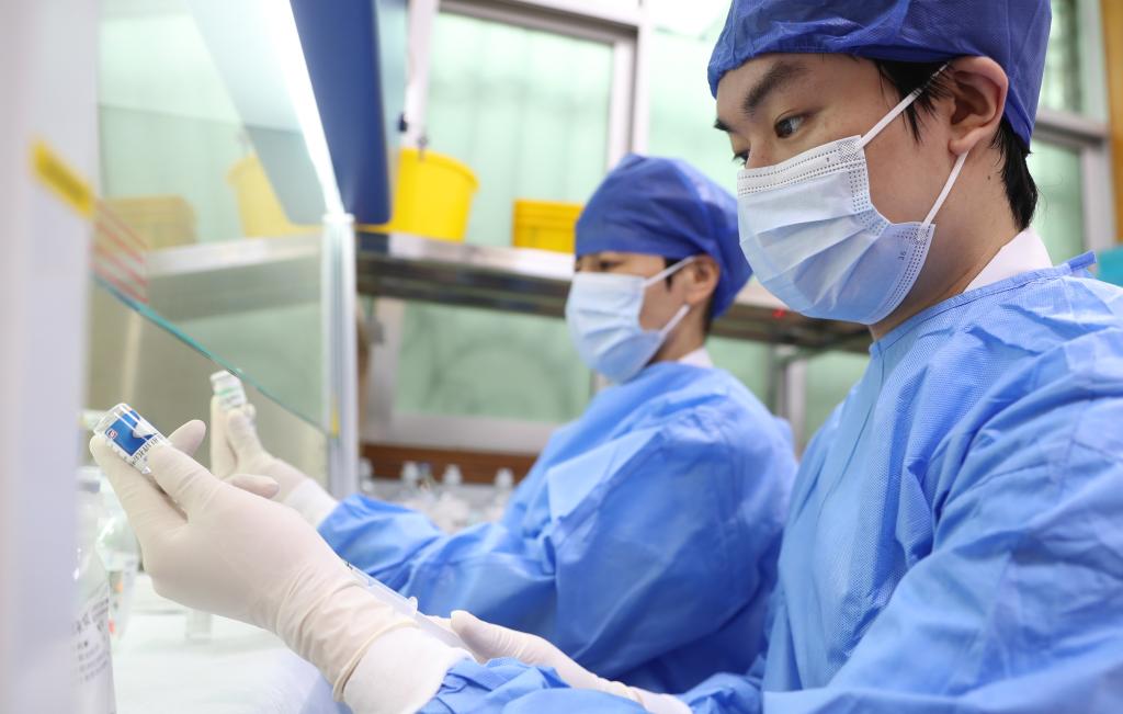 ↑2024年5月9日,湖南省衡阳市南华大学附属第一医院乳腺淋巴瘤病区,周遥(右)和母亲于凤华一起配制药品。CICPHOTO/曹正平 摄