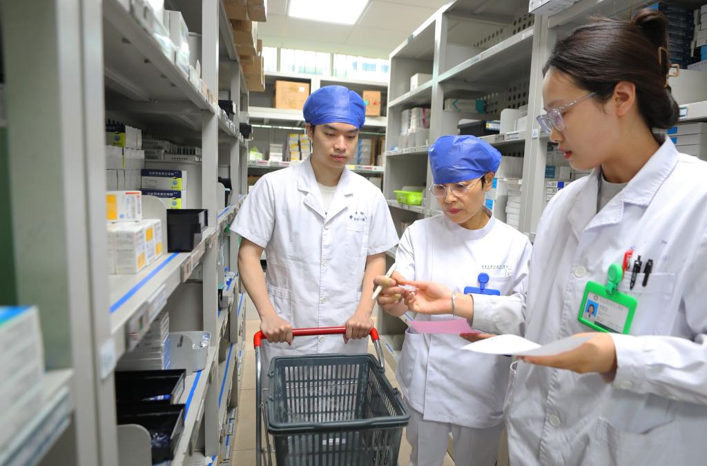 ↑2024年5月9日,湖南省衡阳市南华大学附属第一医院药房,于凤华(中)与周遥(左)在领取药品。CICPHOTO/曹正平 摄