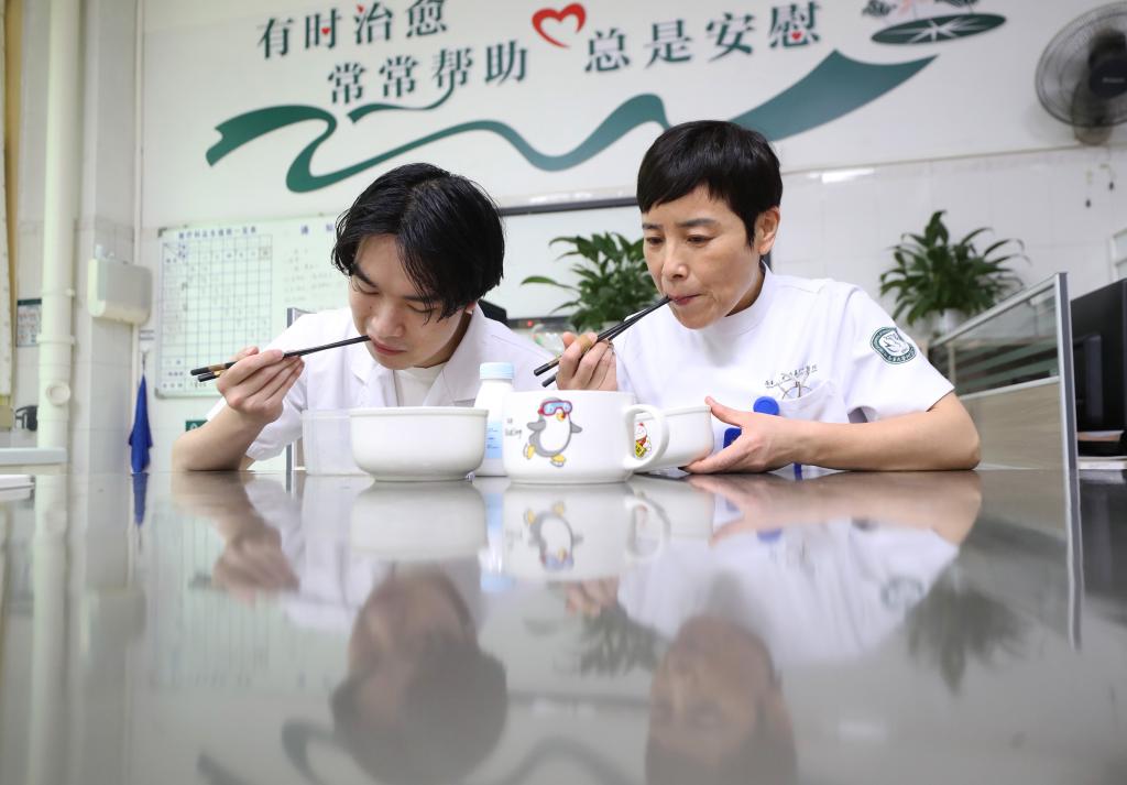 ↑2024年5月9日,湖南省衡阳市南华大学附属第一医院乳腺淋巴瘤病区,于凤华(右)与周遥在吃午饭。CICPHOTO/曹正平 摄