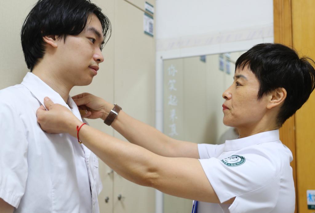↑2024年5月9日,湖南省衡阳市南华大学附属第一医院乳腺淋巴瘤病区,于凤华(右)帮儿子周遥整理护士服。CICPHOTO/曹正平 摄
