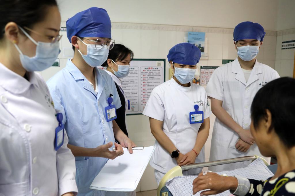↑2024年5月9日,湖南省衡阳市南华大学附属第一医院乳腺淋巴瘤病区,于凤华(左四)与周遥(左五)在参加护理查房。CICPHOTO/曹正平 摄