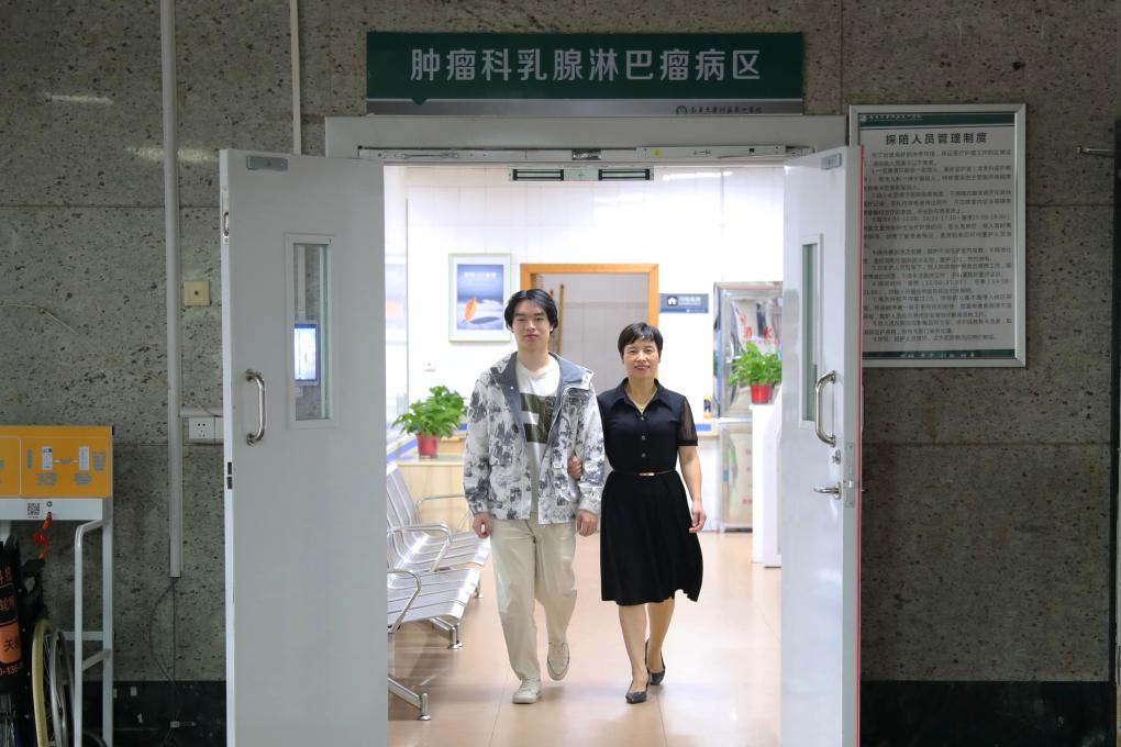 ↑2024年5月9日,湖南省衡阳市南华大学附属第一医院乳腺淋巴瘤病区,于凤华(右)与儿子周遥完成当日工作后一起下班走出病区。CICPHOTO/曹正平 摄