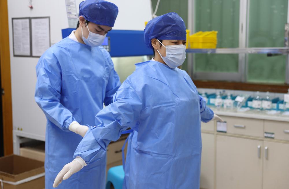 ↑2024年5月9日,湖南省衡阳市南华大学附属第一医院乳腺淋巴瘤病区,周遥(左)帮妈妈于凤华穿隔离服。CICPHOTO/曹正平 摄