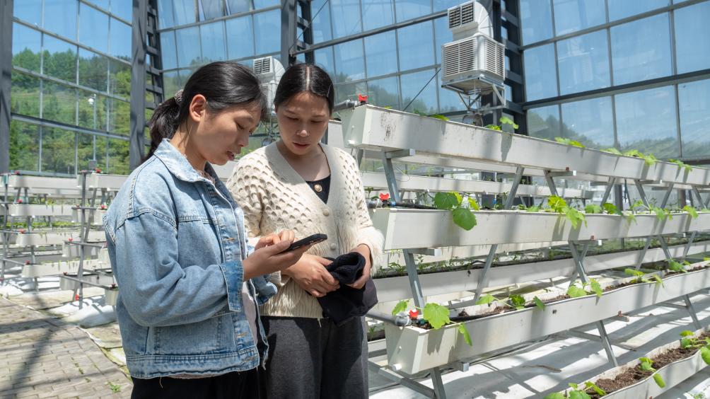 2024年4月24日,徐林艳(左)和郜艳芳(右)通过手机查看大棚实时数据。(黄定懿 摄)