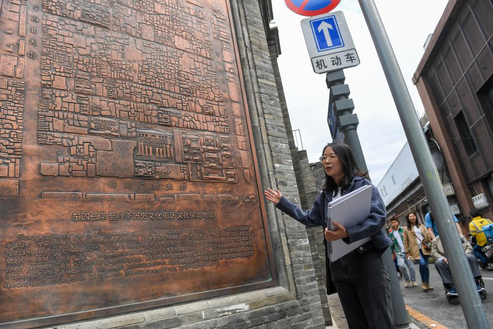 在位于东四南大街60号的宝岛眼镜店前,孙书同介绍此处建筑的改造过程(4月23日摄)。为进一步提升人居环境品质