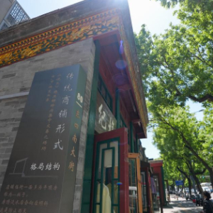 在东四南大街拍摄的介绍东四南大街传统商铺形式的装饰(5月11日摄)。